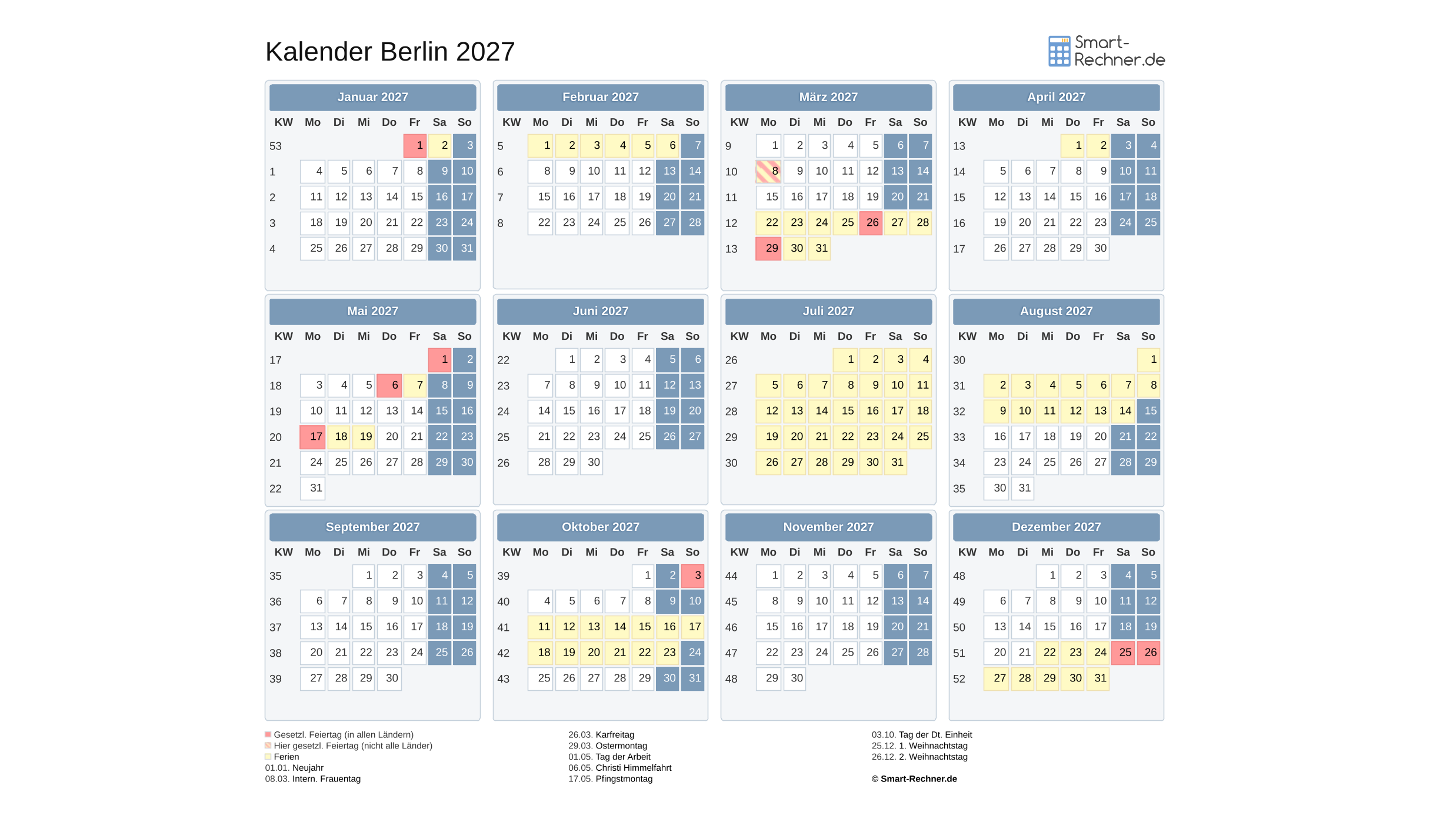 Kalender 2027 mit Ferien und Feiertagen in Berlin
