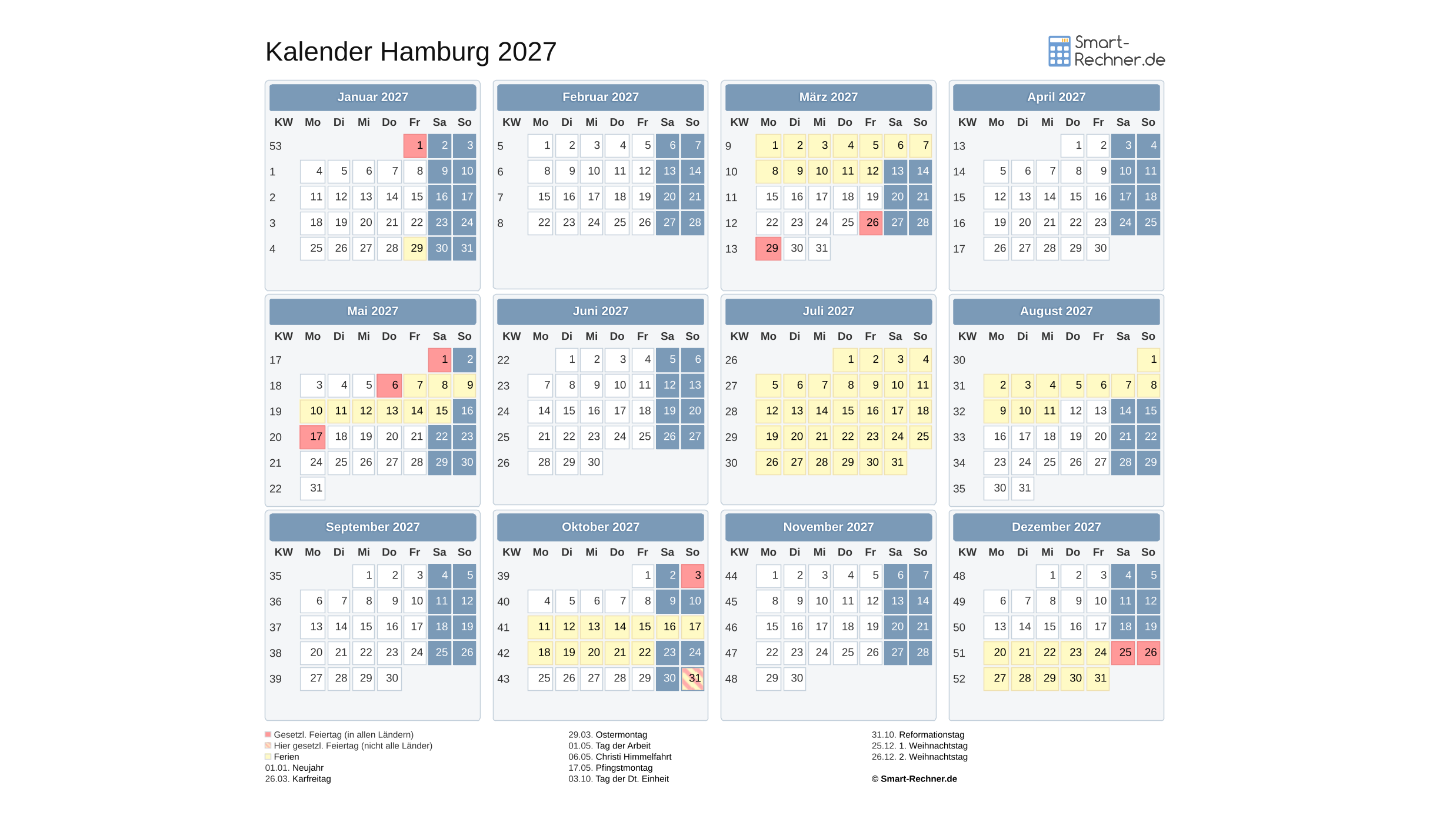 Laden und drucken Sie den Kalender für 2026 und 2027 für Hamburg – mit allen gesetzlichen Feiertagen 2026 und Feiertagen 2027 sowie den Ferien in Hamburg – im PDF- oder PNG-Format.