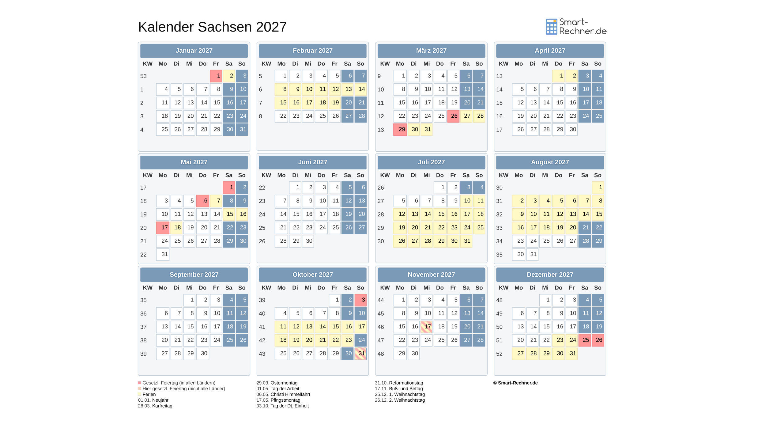 Kalender 2027 mit Ferien und Feiertagen in Sachsen