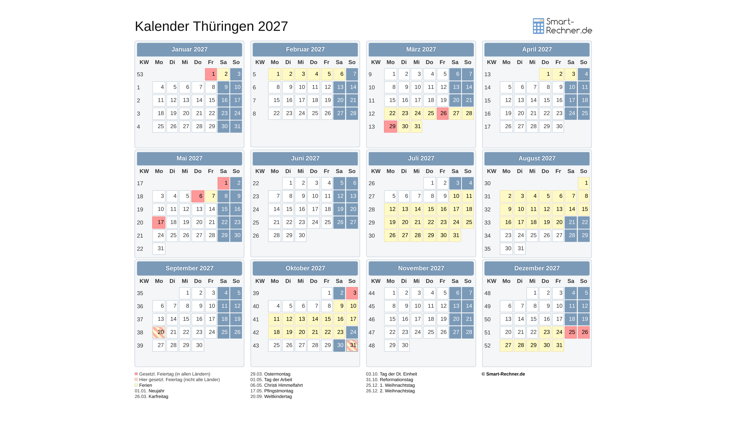 Laden und drucken Sie den Kalender für 2026 und 2027 für Thüringen – mit allen gesetzlichen Feiertagen 2026 und Feiertagen 2027 sowie den Ferien in Thüringen – im PDF- oder PNG-Format.