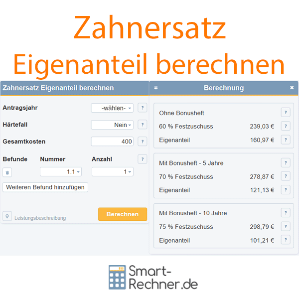 - Der Zahnersatzkosten-Rechner zeigt, welchen gesetzlichen Festzuschuss Ihre Krankenkasse übernimmt und wie hoch Ihr Eigenanteil ist.