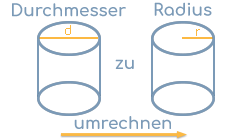 Der Durchmesser (d bzw. ⌀) eines Zylinders ist genau doppelt so groß wie sein Radius (r):